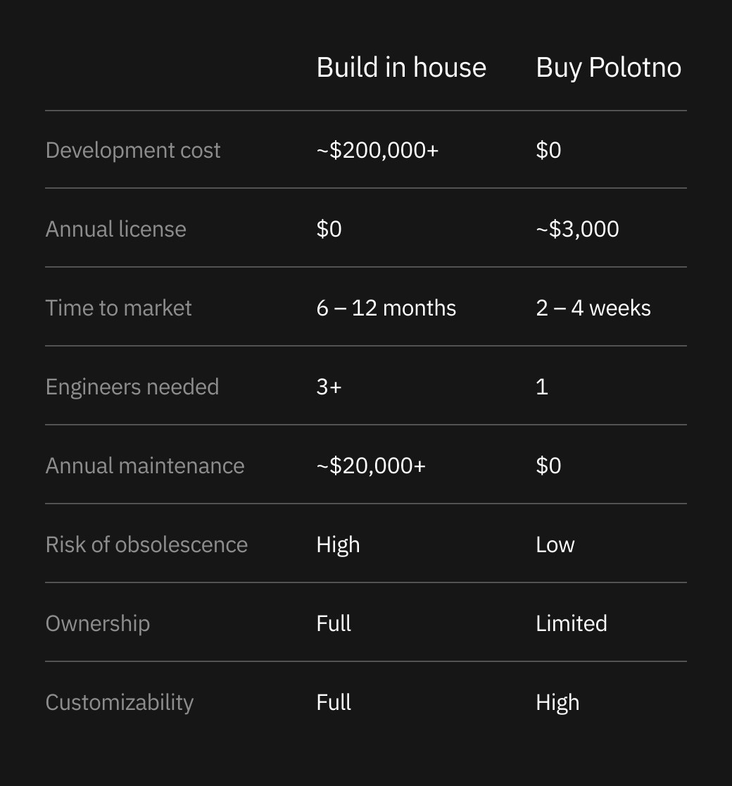 Skip rigid systems and black-box enterprise contracts. Polotno gives you open extensibility plus fast support and a community invested in your success.